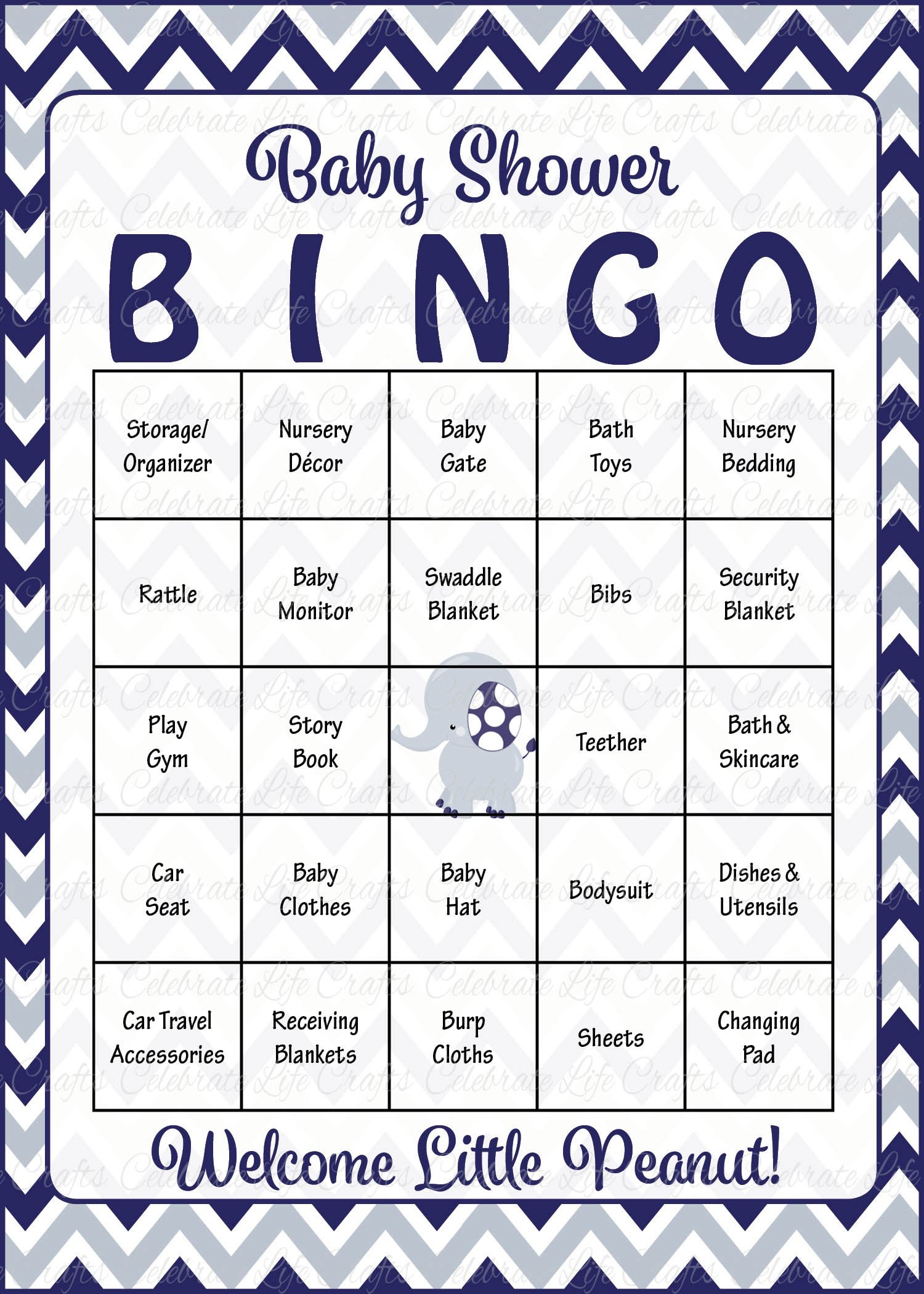 Playing baby bingo is simple and easy. Just distribute the cards to your guests and have them fill in the squares with gifts they think the mom-to-be will receive. As the gifts are opened, guests can mark off the corresponding squares on their cards. The first guest to get five in a row – horizontally, vertically, or diagonally – wins a prize!