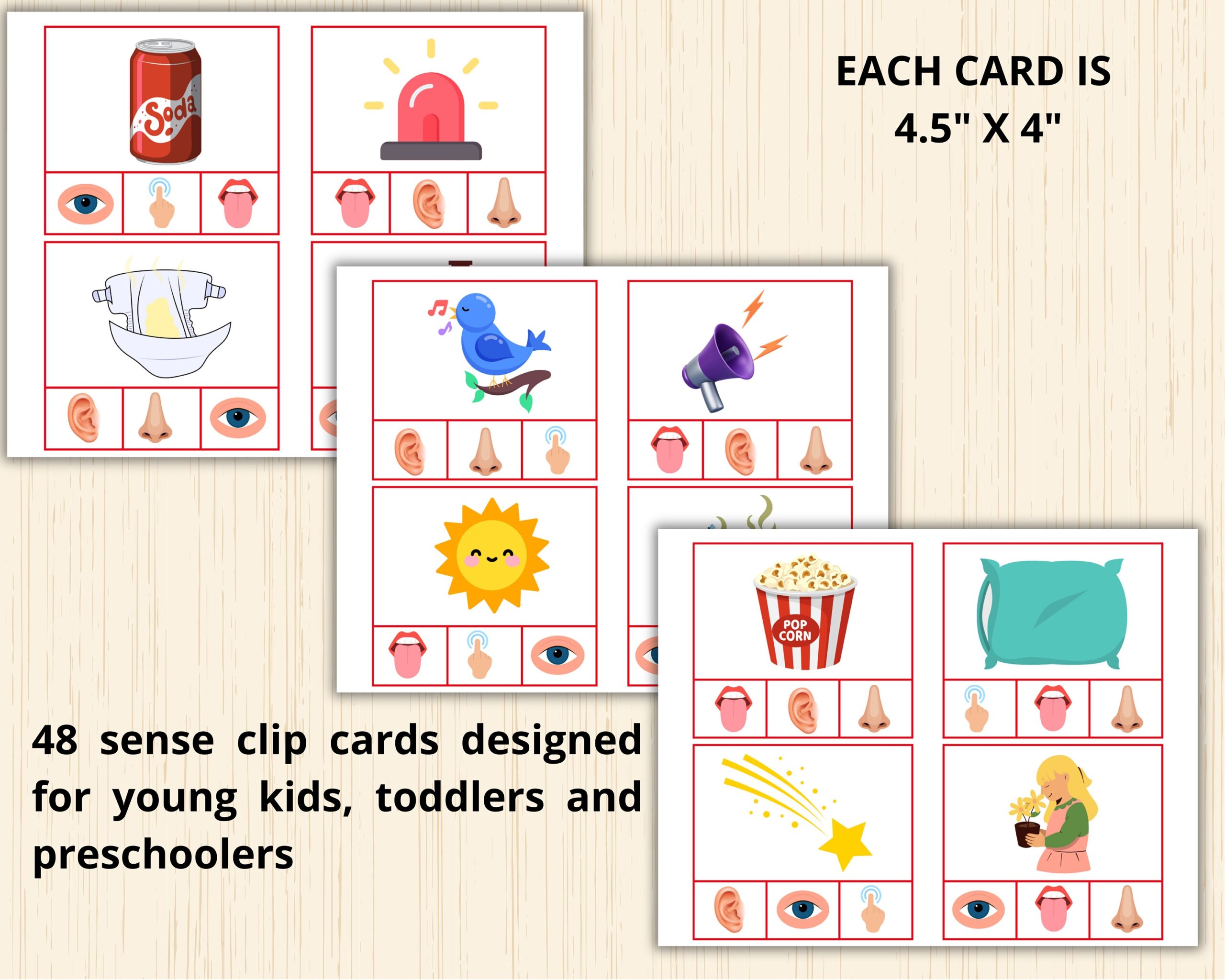 Each set of clip cards includes a variety of images that represent different sensory experiences. For example, children can match a picture of a flower to the sense of smell, or a picture of a musical instrument to the sense of hearing. These hands-on activities make learning about the senses fun and memorable.