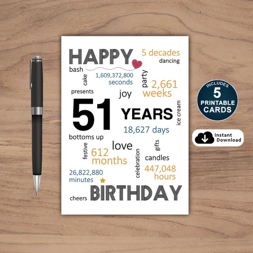 Make their birthday celebration extra special with a personalized touch that they will appreciate. Download a 51st birthday card printable today and make their day one to remember!