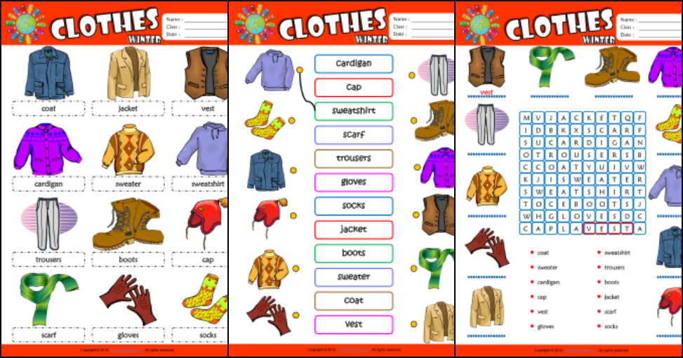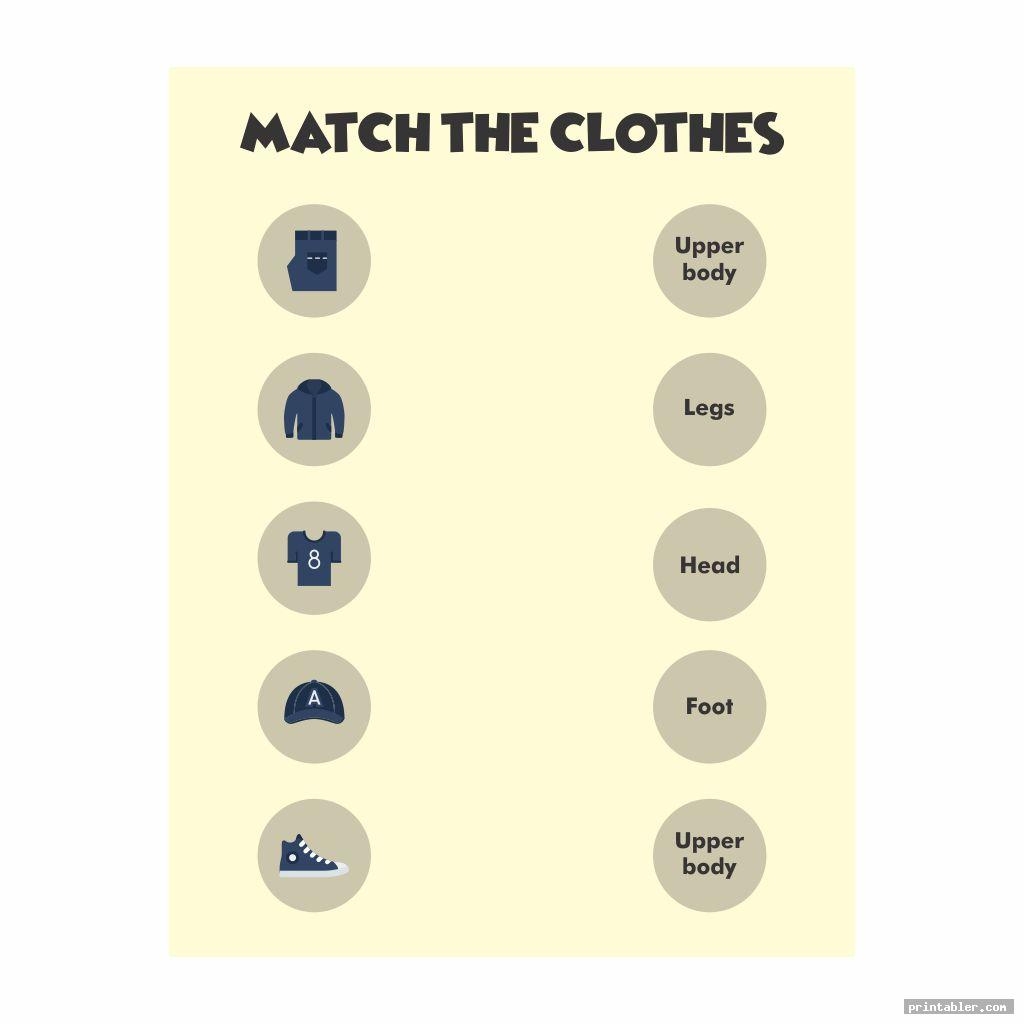 One popular type of clothes printable worksheet is the “Clothes Matching Game,” where children are tasked with matching pictures of clothes to their corresponding names. This helps children associate the image of the clothing item with its name, improving their recognition and memory skills.