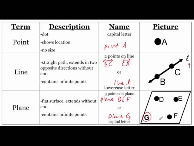 Points are the most basic objects in geometry. They have no size, shape, or dimensions. Points are usually represented by a dot and are used to define the location of other geometric objects. Lines are straight paths that extend infinitely in both directions. They are made up of an infinite number of points and can be described by two points on the line or by a single equation. Planes are flat surfaces that extend infinitely in all directions. They are defined by three non-collinear points or by a single equation.