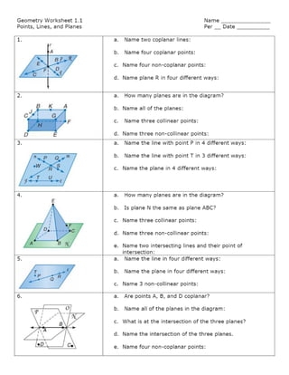 One common type of question on a geometry points lines and planes worksheet is to identify the intersection points of two lines or planes. This involves finding the point where the two lines or planes meet, which can be determined by solving a system of equations. Another type of problem may ask students to calculate the distance between a point and a line or plane, which requires knowledge of perpendicular lines and the distance formula.
