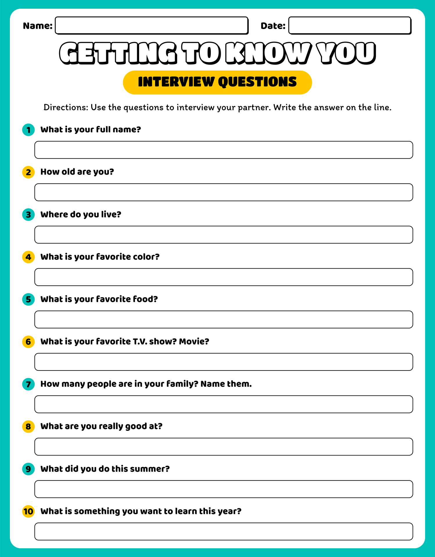 Overall, incorporating get-to-know-you questions into your classroom can help foster a positive and inclusive environment for students. It can encourage communication, build relationships, and create a sense of belonging among students. So, consider using a worksheet with these questions to kick off the school year and set a positive tone for the rest of the term.