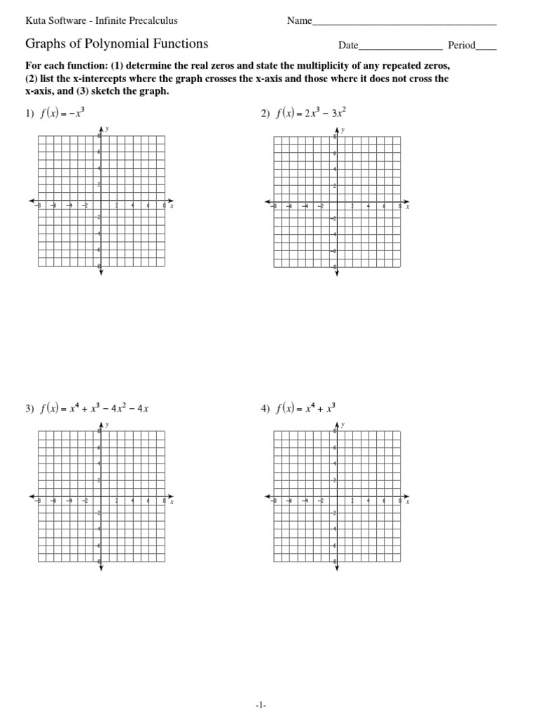Graphing polynomials is an important skill in algebra and calculus. It helps us visualize the behavior of polynomial functions and understand their properties. One way to practice graphing polynomials is by using worksheets that provide various polynomial equations to graph. These worksheets typically include instructions on how to graph the polynomials and may also include questions to test your understanding of the concepts.