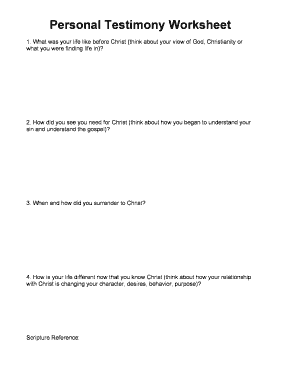 When writing your testimony worksheet, start by outlining the key points you want to cover. This could include your life before coming to faith, how you encountered God, the impact of your faith on your life, and any specific examples of answered prayers or miracles. Organize these points in a logical order to create a coherent narrative that flows smoothly.