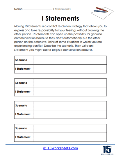 Another popular activity in I statements worksheets is the “Role-Play Scenarios.” In this exercise, individuals are given different scenarios that may trigger negative emotions or conflicts. They are then asked to role-play these scenarios, using I statements to express their feelings and needs. This hands-on practice allows individuals to apply their knowledge of I statements in real-life situations.