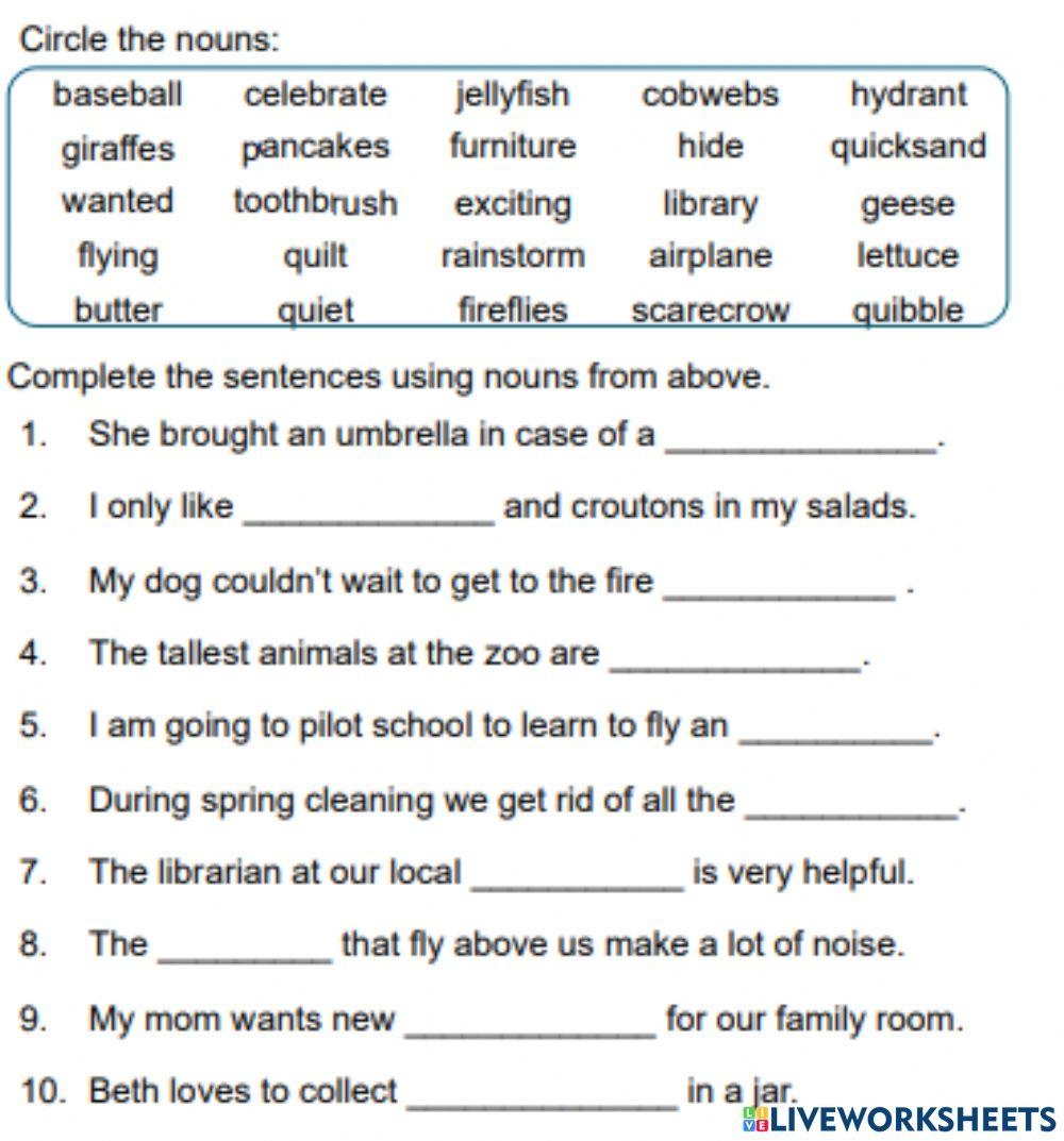 Another type of worksheet may ask students to categorize nouns into different types. For example, students may be given a list of words and asked to identify which ones are common nouns, proper nouns, abstract nouns, or collective nouns. This activity can help students distinguish between different types of nouns and understand their various functions in a sentence.