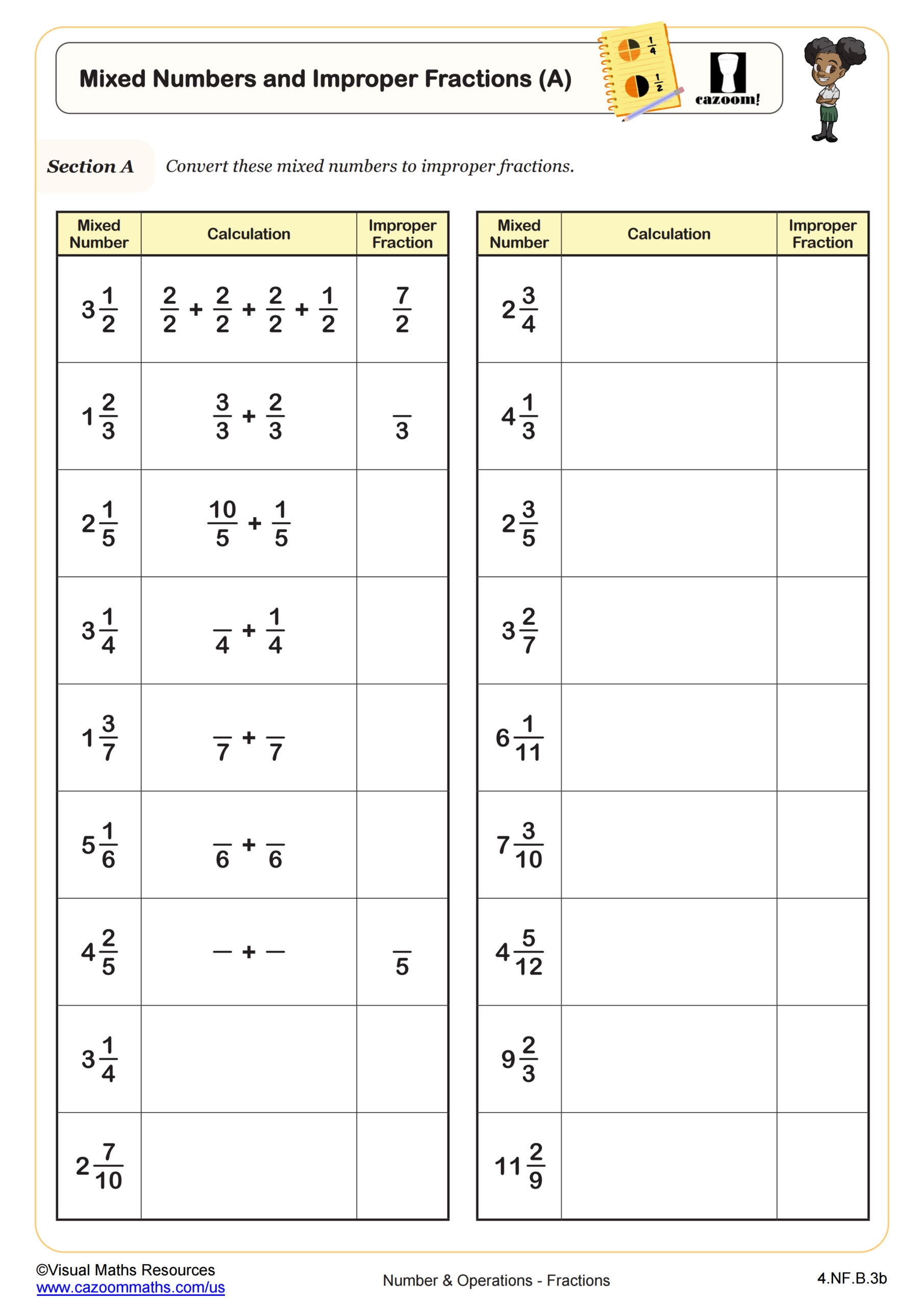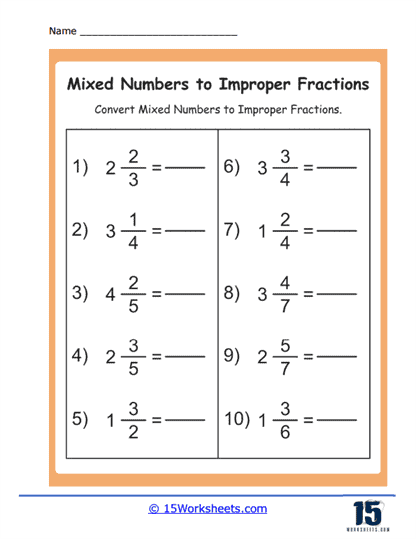 One way to practice converting improper fractions to mixed numbers is by using worksheets. These worksheets typically provide a series of improper fractions that students must convert to mixed numbers. This exercise helps students reinforce their understanding of the relationship between improper fractions and mixed numbers, as well as their ability to perform the conversion accurately.