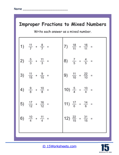 Working through a series of such exercises helps students gain confidence in converting between improper fractions and mixed numbers. It also reinforces their understanding of how fractions can be represented in different forms while still representing the same quantity.