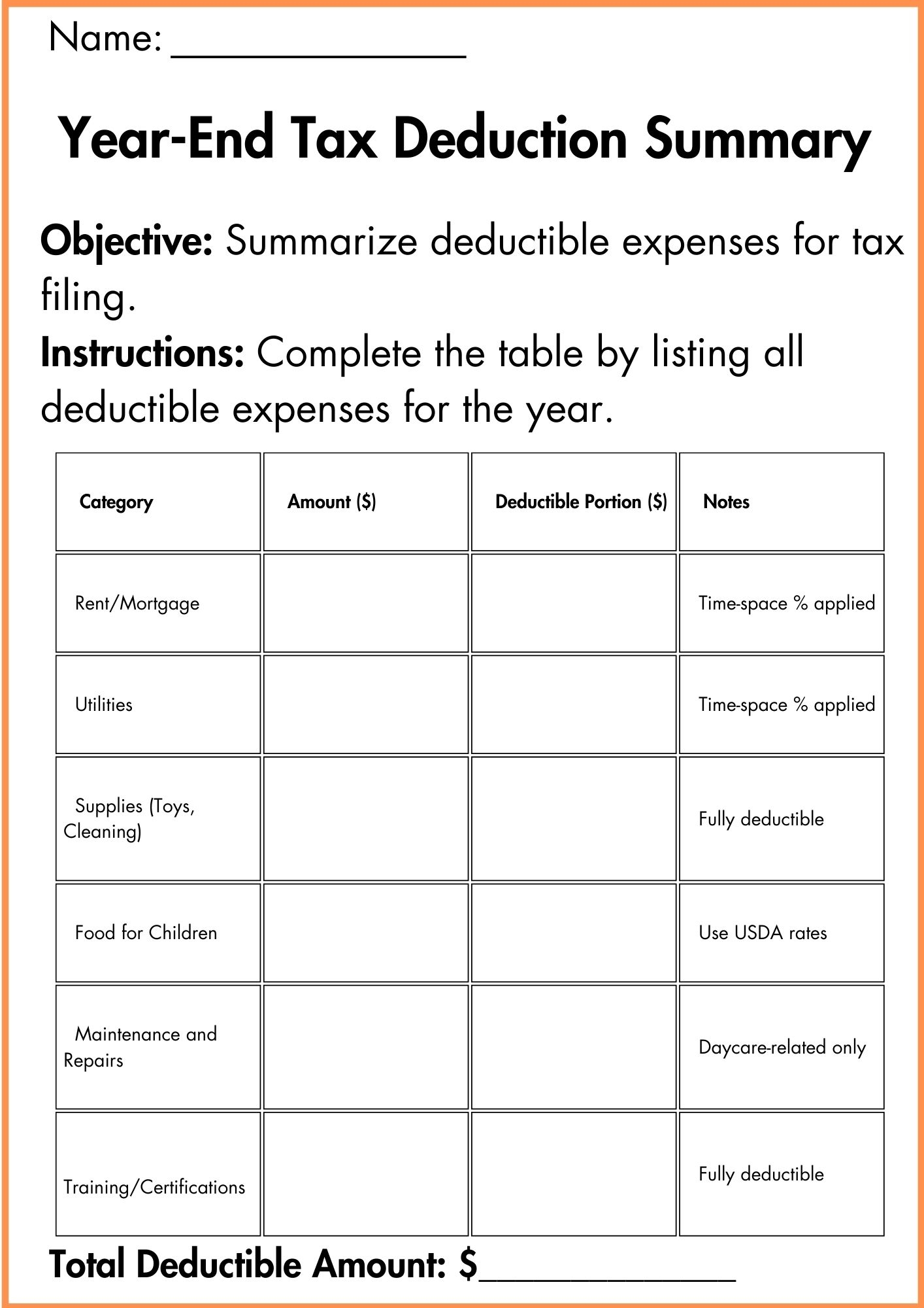 Running an in-home daycare can be a rewarding experience, but it also comes with its fair share of expenses. Luckily, there are tax deductions available to help offset some of these costs. One way to ensure you are maximizing your deductions is by using a tax deduction worksheet specifically designed for in-home daycare providers.