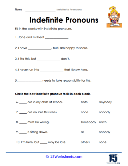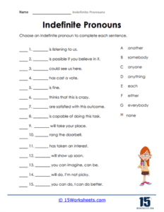 A worksheet focusing on indefinite pronouns can help students practice and reinforce their understanding of these important words. By providing exercises and examples, a worksheet can help students identify and correctly use indefinite pronouns in sentences. This hands-on approach can make learning grammar more engaging and effective.