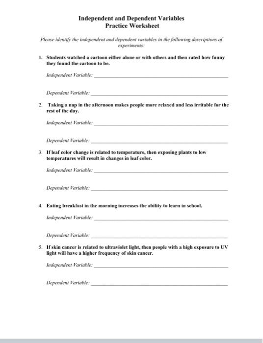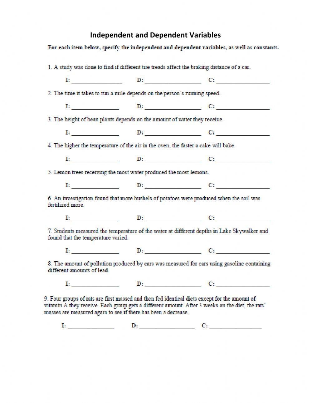 A worksheet focusing on independent and dependent variables can help students grasp these concepts effectively. The worksheet typically includes scenarios or experiments where students have to identify the independent and dependent variables, as well as the control variables, if any.