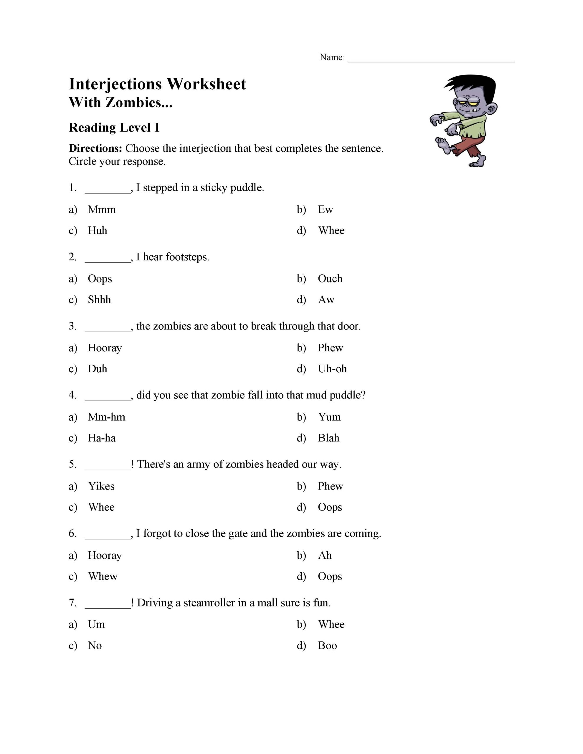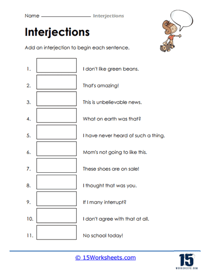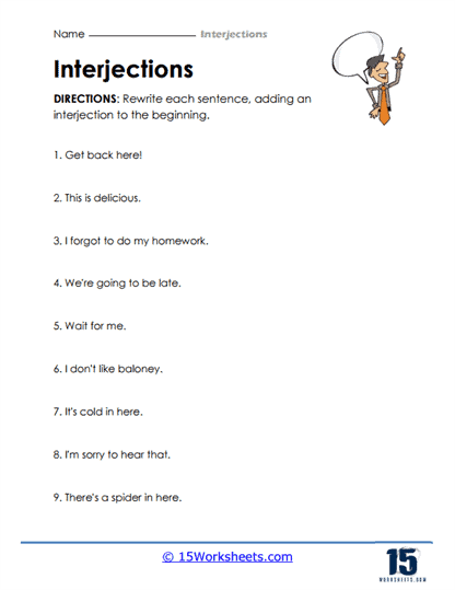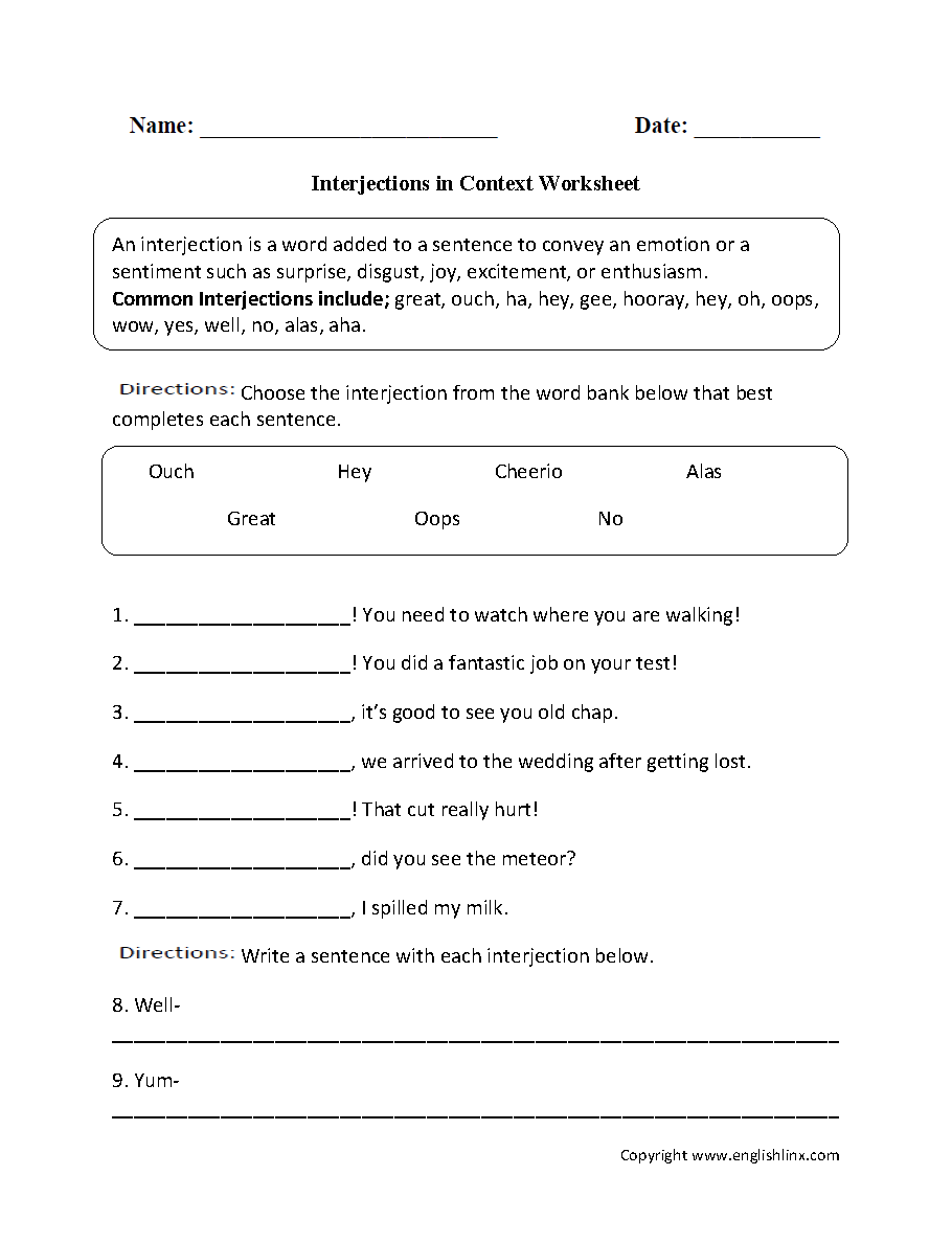 Here are some examples of exercises that may be included in an interjections worksheet: