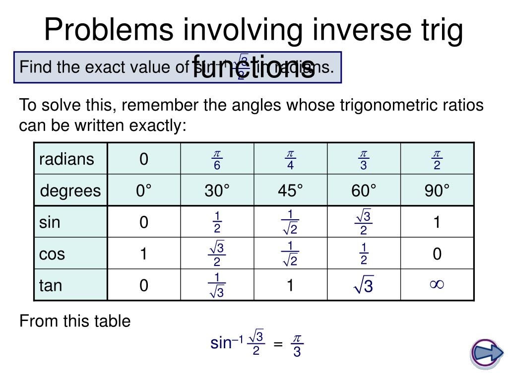 Students will also encounter problems that involve finding the values of inverse trig functions for different angles. This will help them develop a deeper understanding of how inverse trig functions work and how they relate to regular trig functions.