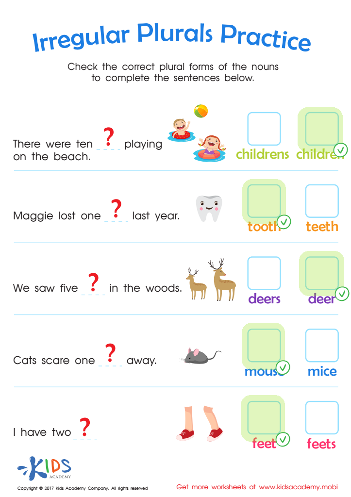 Some worksheets may also include writing prompts that require students to use both irregular and plural nouns in sentences. This type of activity encourages students to apply their knowledge of irregular and plural nouns in a creative way, helping them see the practical application of these grammar rules in everyday language use.