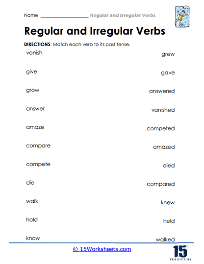 Another type of irregular verb past tense worksheet is the matching exercise. In these worksheets, students are provided with a list of present tense irregular verbs and their corresponding past tense forms. Students must then match the present tense verb with its correct past tense form. This type of worksheet helps students reinforce their knowledge of irregular verb forms and their past tense equivalents.