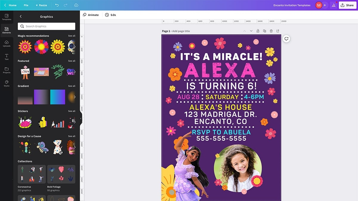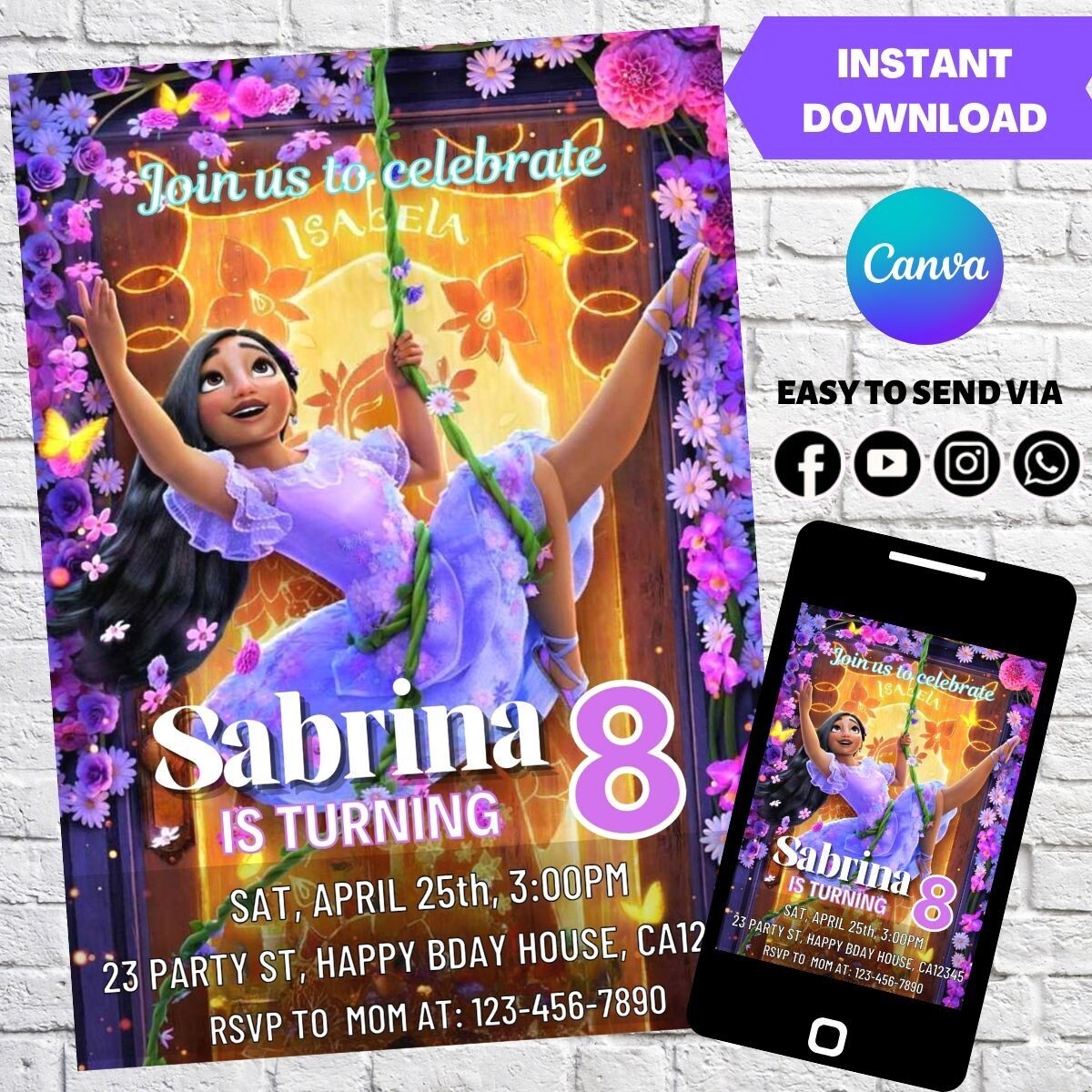 Overall, the Isabela Encanto invitation template is a stylish and versatile option for anyone looking to create a memorable invitation for their special event. With its modern design, customizable features, and user-friendly interface, this template is sure to impress your guests and set the tone for a fabulous celebration.