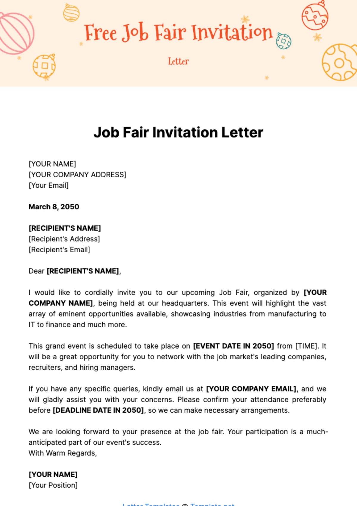 We are delighted to invite you to our upcoming job fair on [Date] at [Location]. This event will bring together a diverse range of employers from various industries who are actively seeking talented individuals like yourself to join their teams. Whether you are looking for a full-time position, an internship, or a part-time job, our job fair has something for everyone.