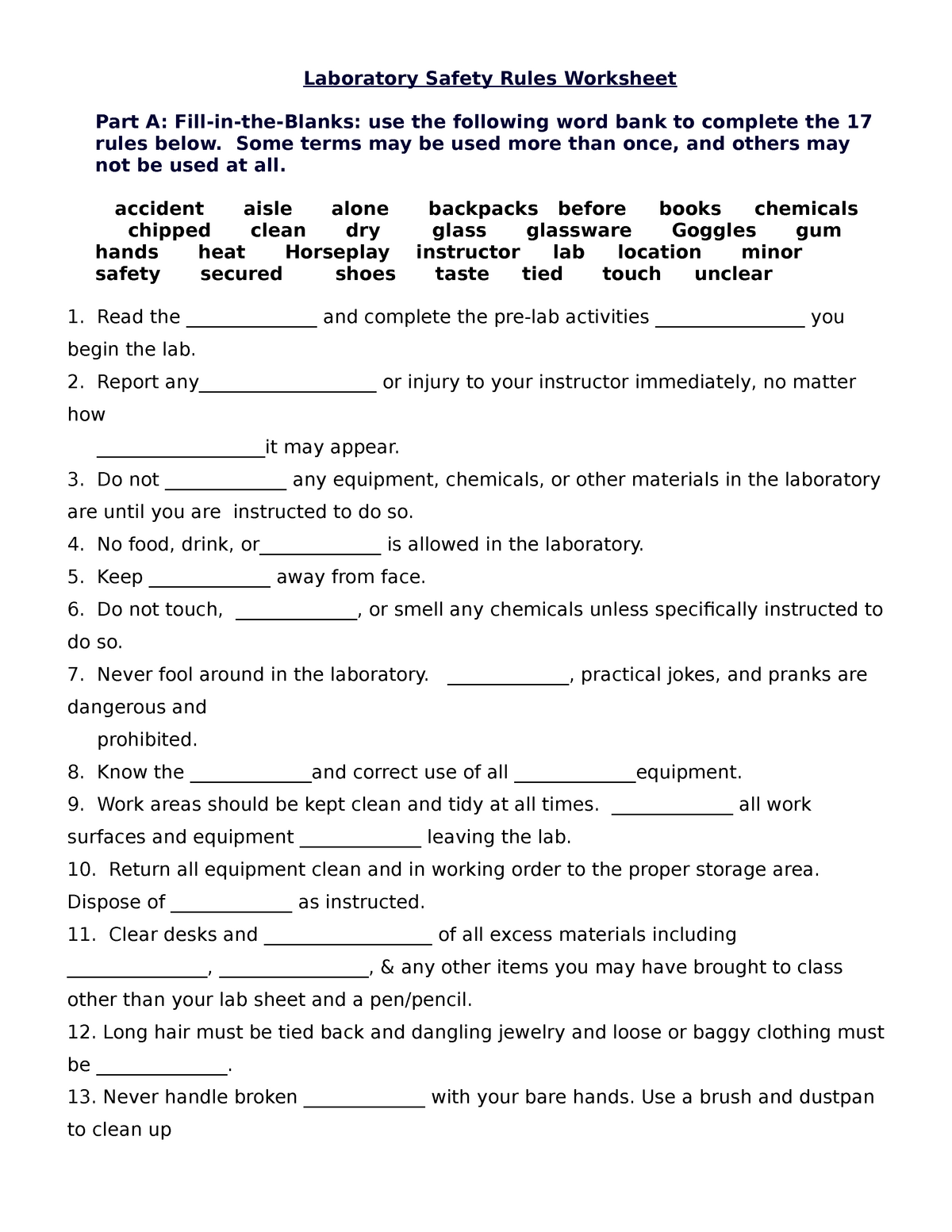 Safety Rules Fill In The Blank Laboratory Safety Rules Worksheet