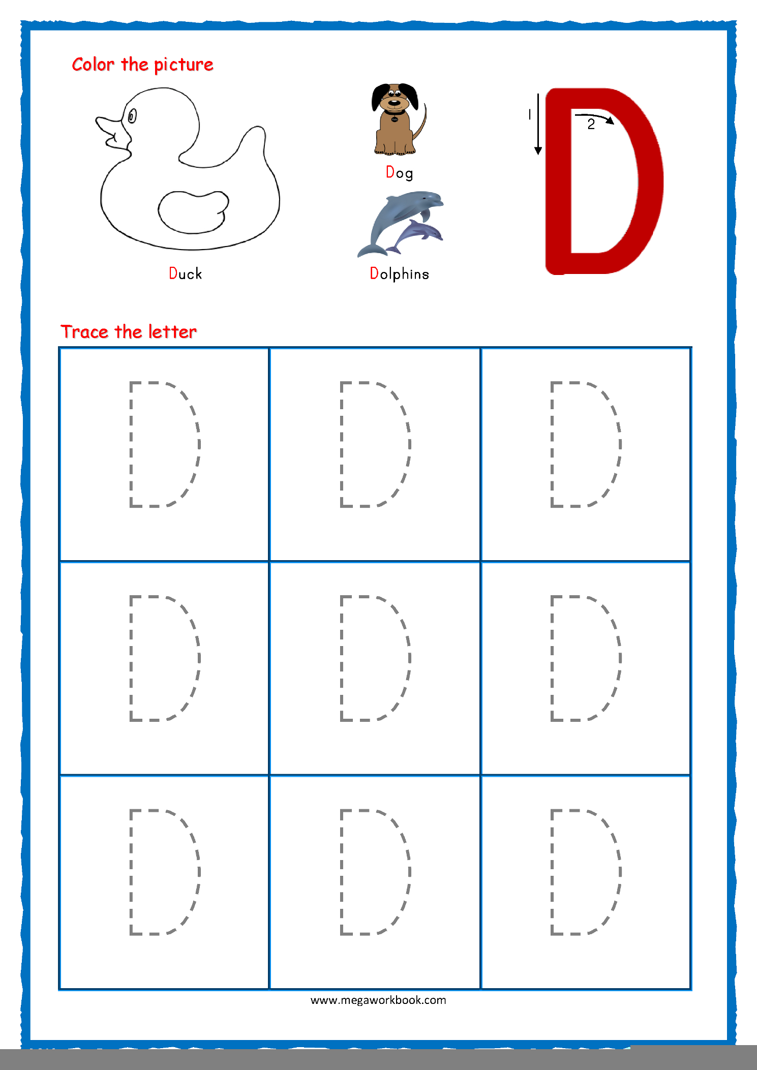1. Trace the uppercase letter D: This worksheet provides a large, dotted uppercase D for children to trace. It also includes space for children to practice writing the letter on their own.