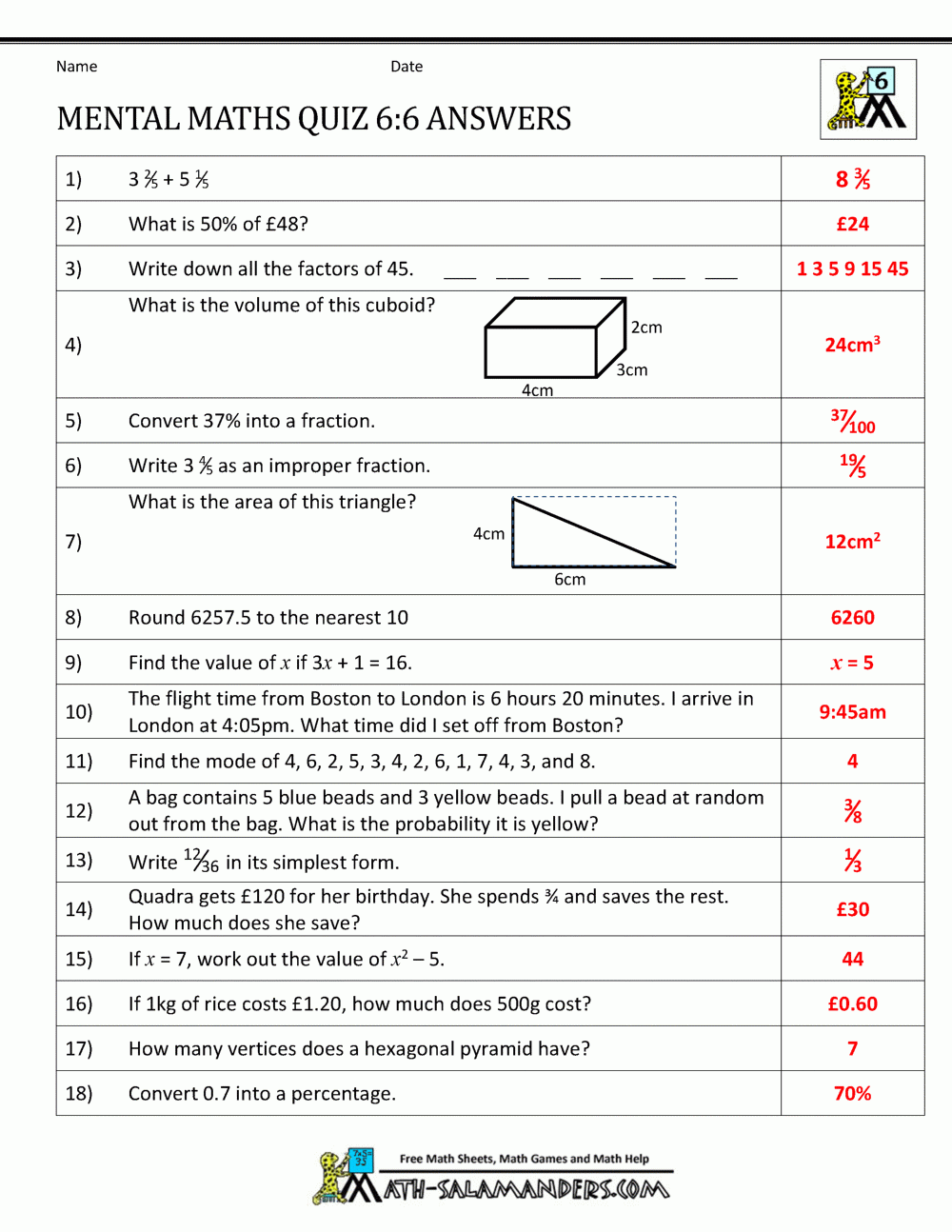 Year 6 Mental Maths Worksheets Worksheets For Kindergarten