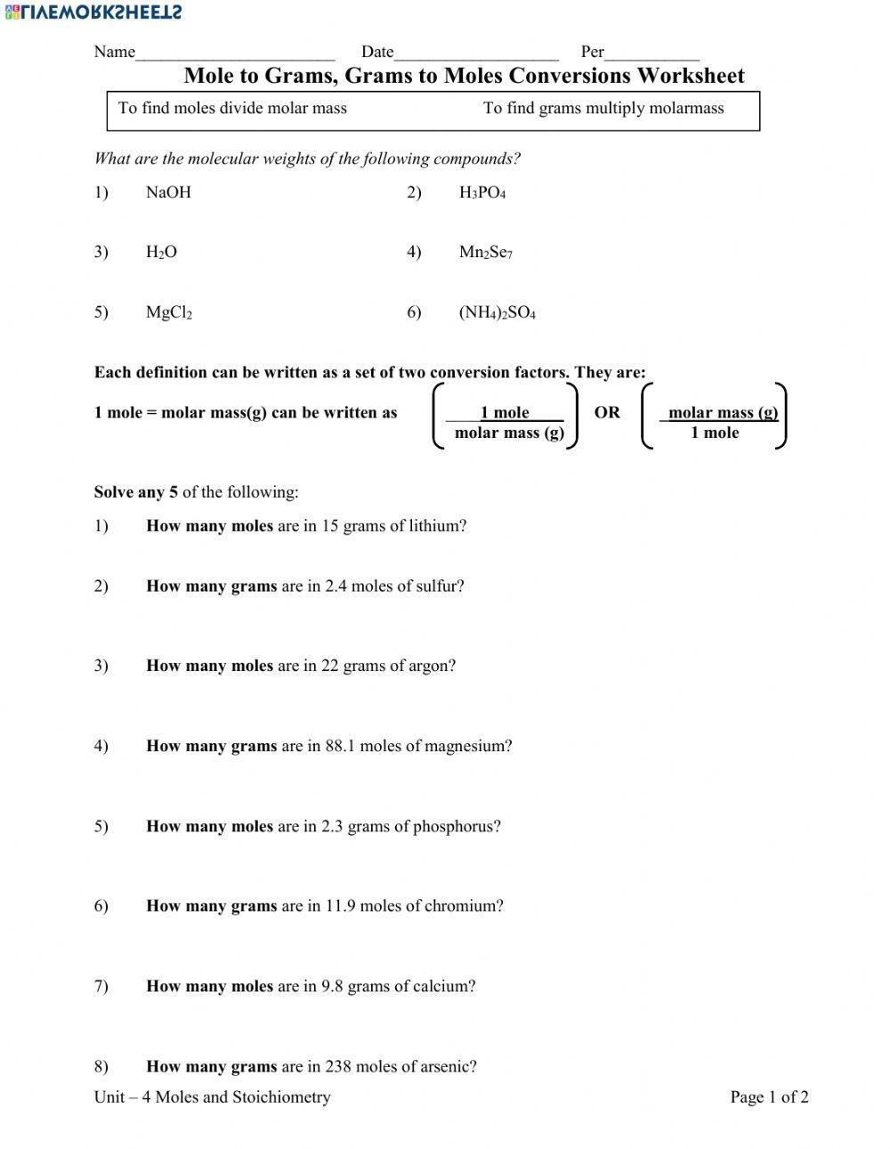 Download and Print moles worksheet Listed below