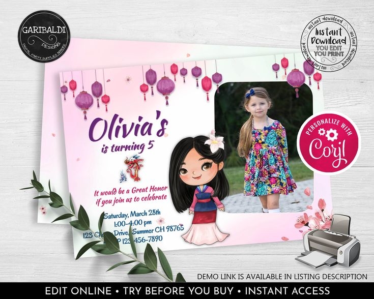 Editable Mulan Invitation Printable Mulan Photo Invitation Instant