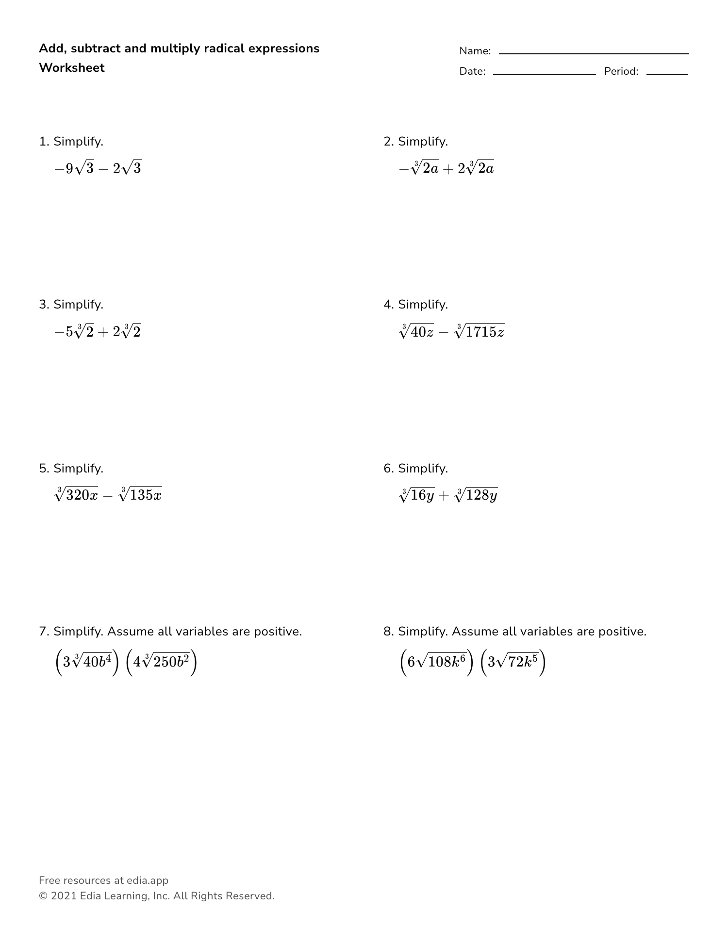 Multiplying Radicals Worksheet