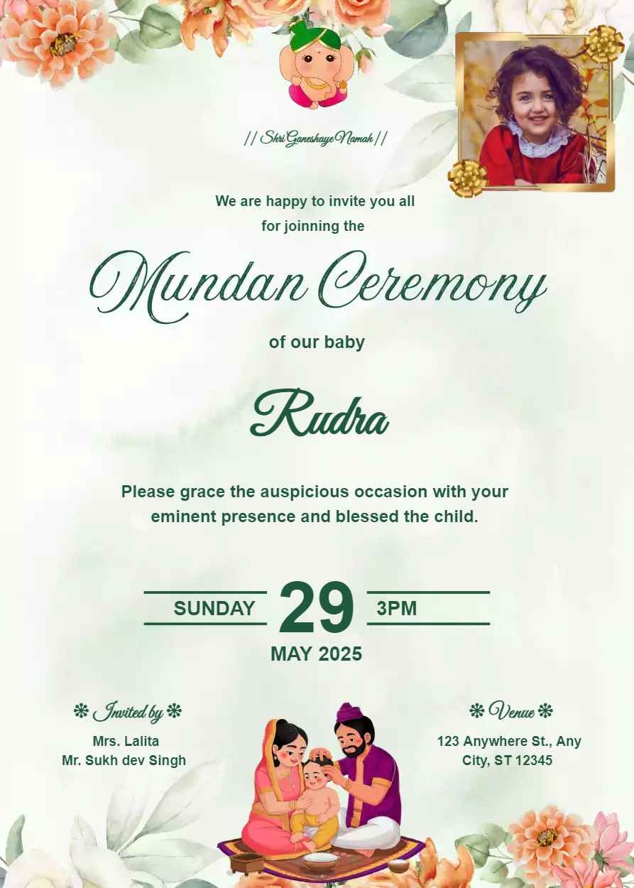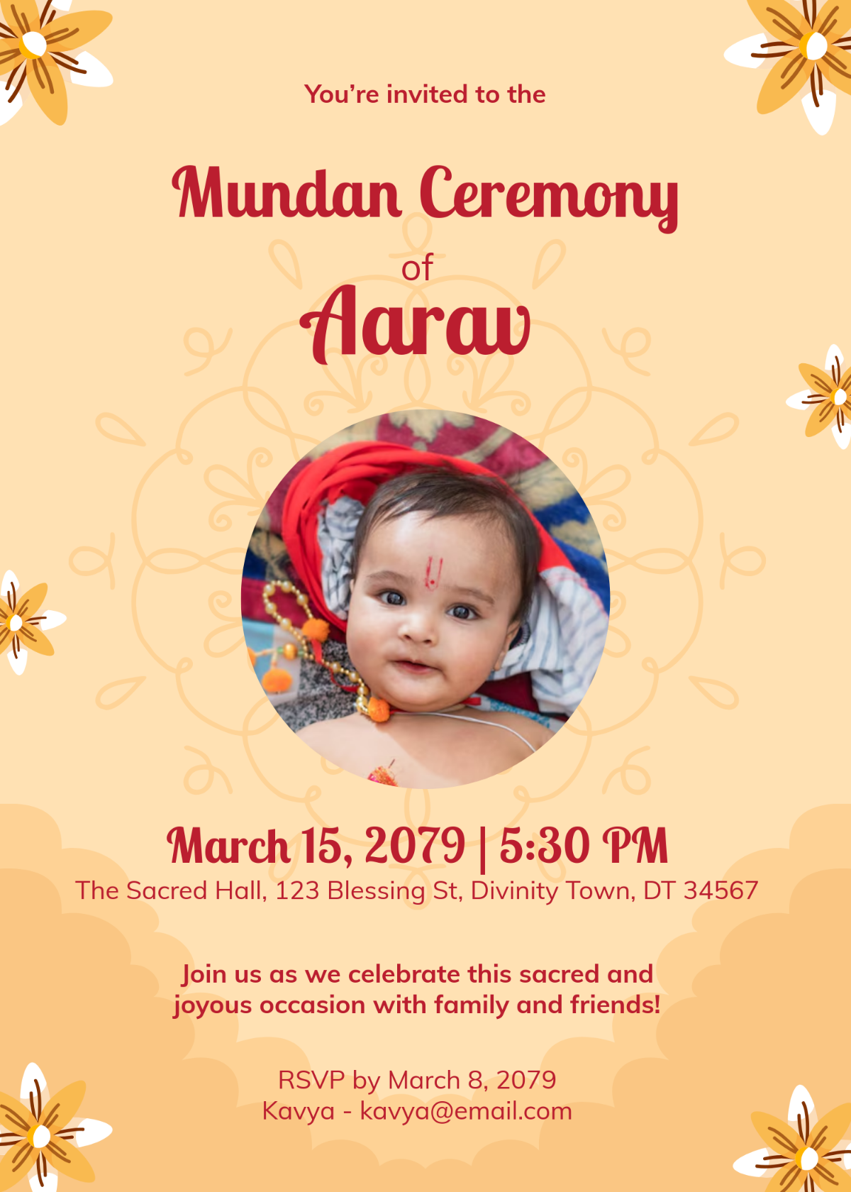 Once you have selected the perfect Mundan ceremony invitation template, you can easily customize it to suit your preferences. Add your child’s name, personalize the colors and fonts, and make any other changes to make the invitation uniquely yours. With a beautifully designed invitation, you can set the tone for a memorable and joyous Mundan ceremony that will be cherished for years to come.