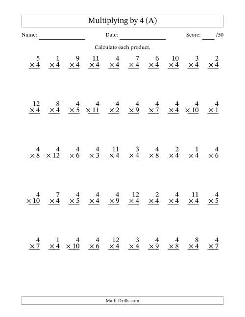Multiplying 1 To 12 By 4 50 Questions A Worksheets Library