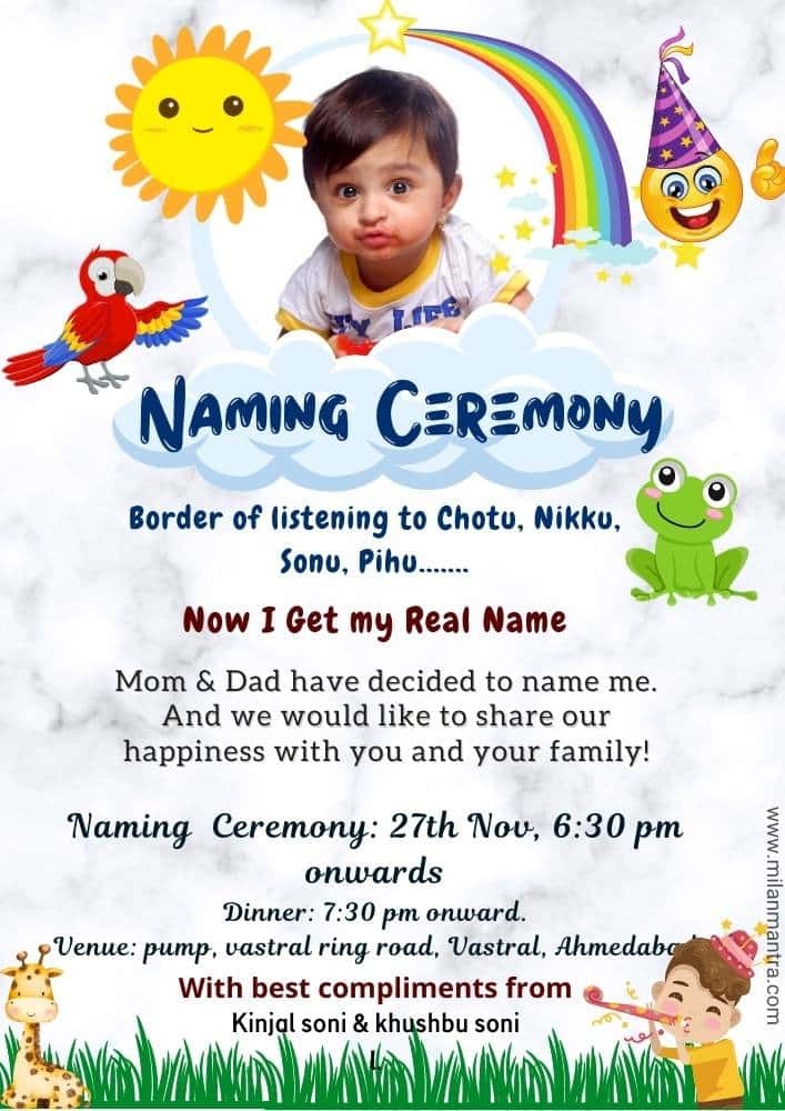A naming ceremony is a special event where a child is given a name and welcomed into the family and community with love and joy. It is a time for celebration and sharing the happiness with friends and family. To make this occasion even more memorable, it is important to send out invitations that reflect the significance of the event.