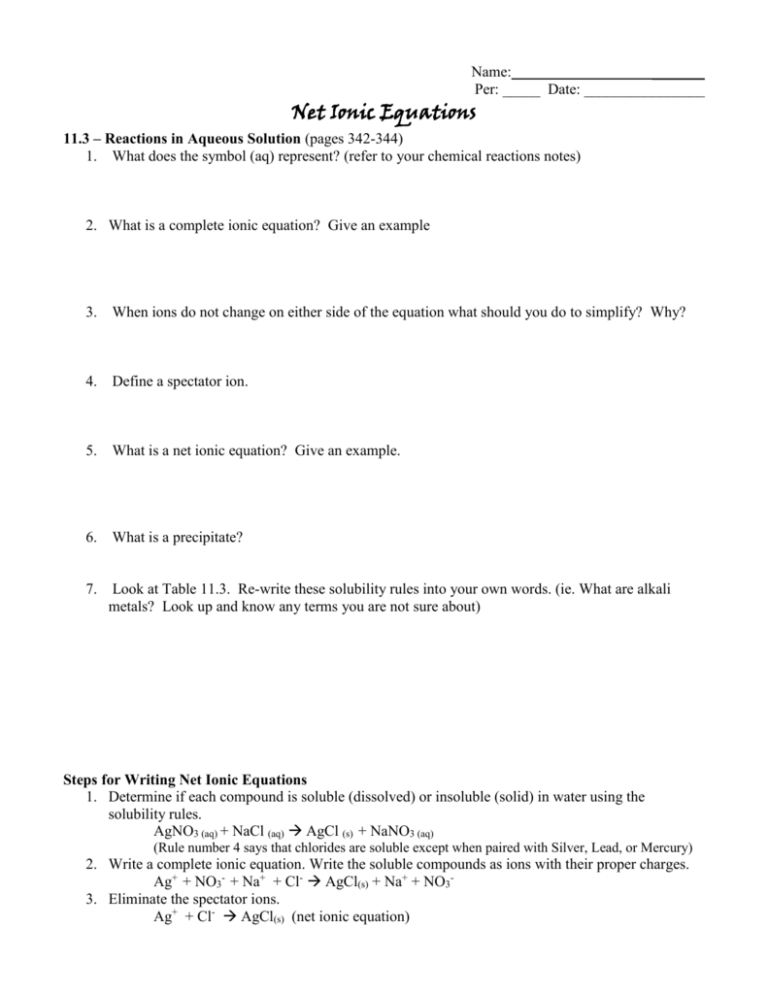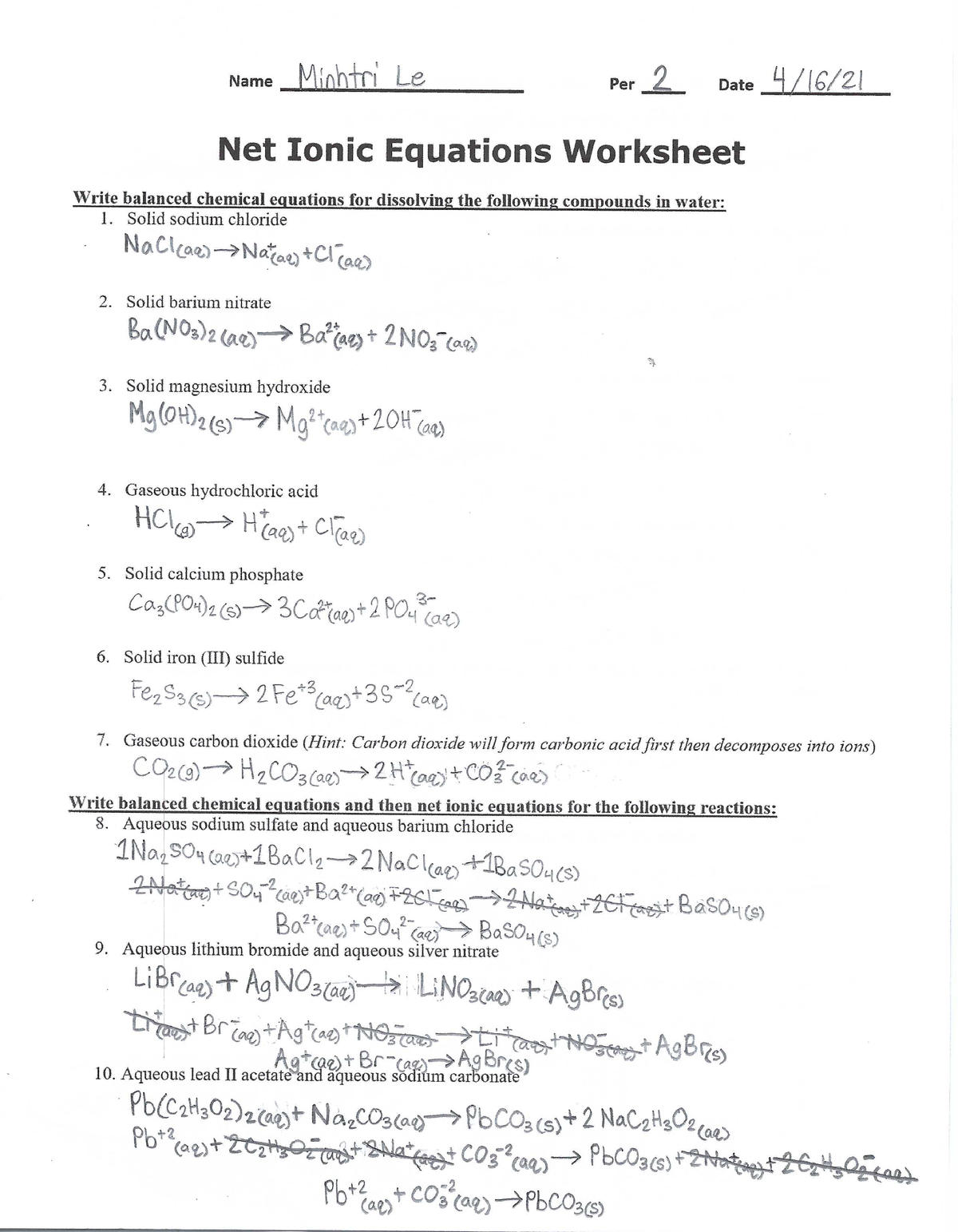Net Ionic Equations Worksheet Chemistry Practice