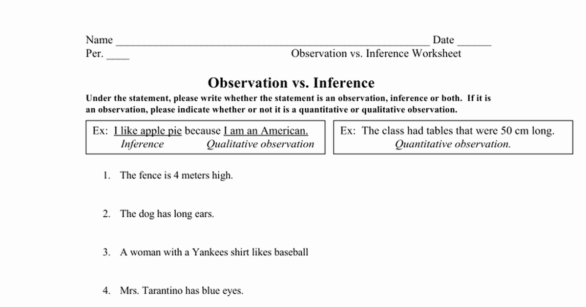 Another type of worksheet may involve analyzing data or information and determining whether certain statements are observations or inferences. For instance, a statement like “The temperature is dropping, so it will snow soon” would be an inference, as it is based on a correlation between temperature and snowfall. In contrast, a statement like “The thermometer reads 32 degrees Fahrenheit” would be an observation, as it is a direct measurement of temperature.
