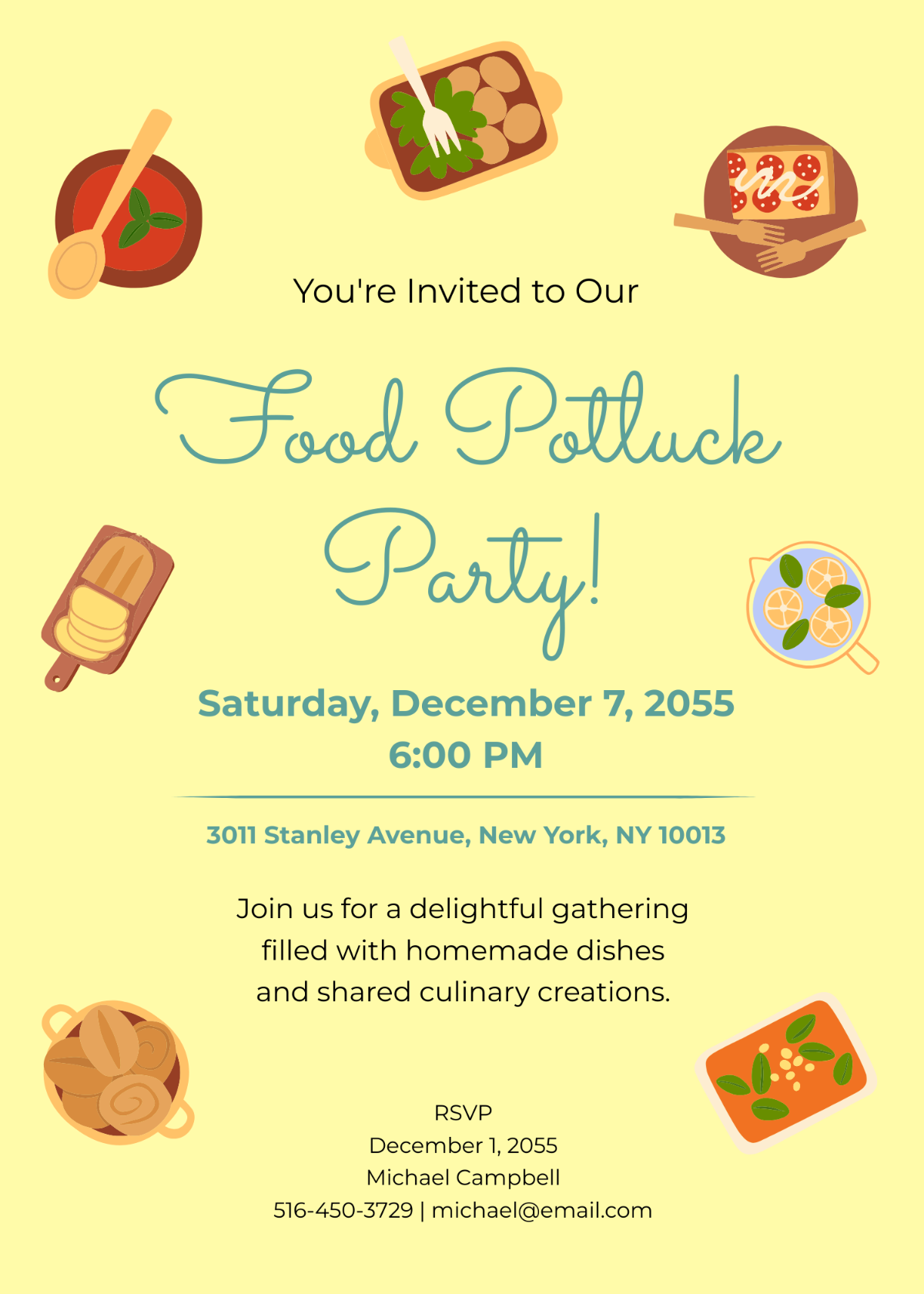 - Customizable fields for date, time, and location of the potluck