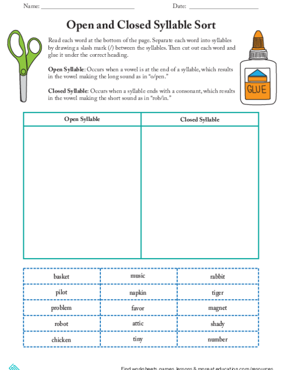 Open and Closed Syllable Worksheets