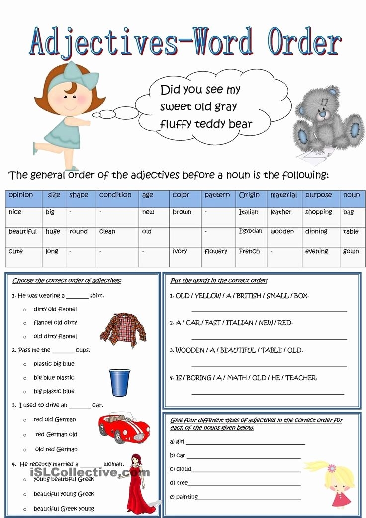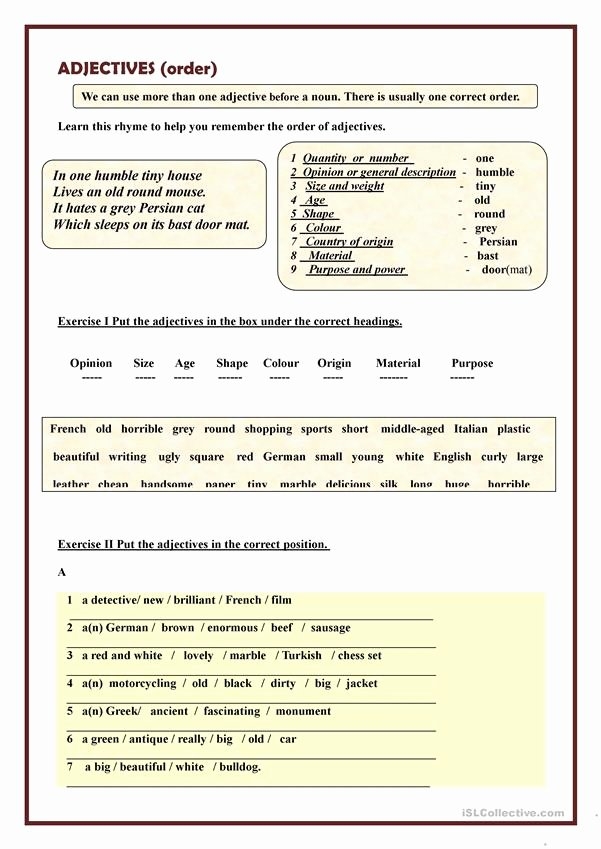 A worksheet on the order of adjectives can provide students with the opportunity to practice arranging multiple adjectives in the correct order. The worksheet may include sentences with missing adjectives or jumbled adjectives that need to be rearranged. Students can work individually or in pairs to complete the worksheet and then review their answers as a class.