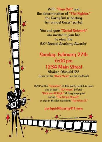 Don’t forget to include RSVP information so you can get an accurate headcount for your party. You can also use the invitation as an opportunity to request that guests come dressed as their favorite movie star or in their most glamorous attire. Encourage everyone to bring their own popcorn and award predictions for a fun-filled evening of Oscar-watching and friendly competition.