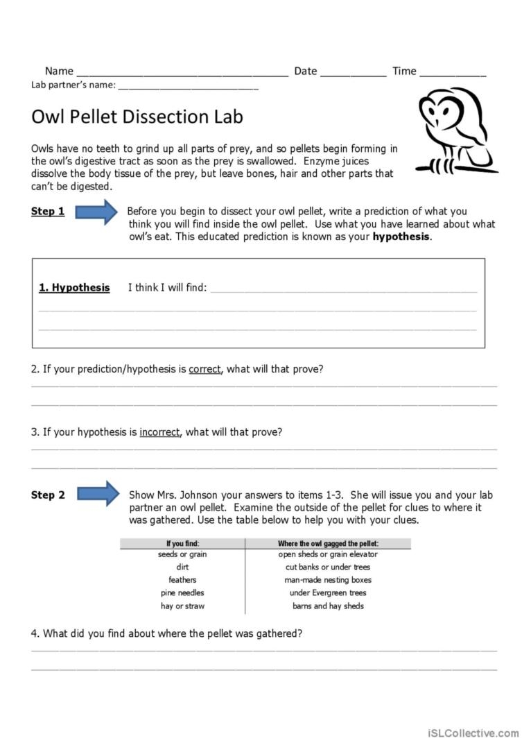 Before beginning the dissection, students can use a worksheet to record their observations and findings. The worksheet may include questions about the size and shape of the pellet, the types of bones and fur found inside, and any hypotheses about the owl’s diet based on the contents of the pellet. By completing the worksheet, students can organize their thoughts and data, making it easier to draw conclusions from their dissection.