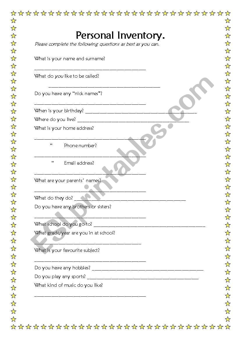 Personal Inventory Worksheet