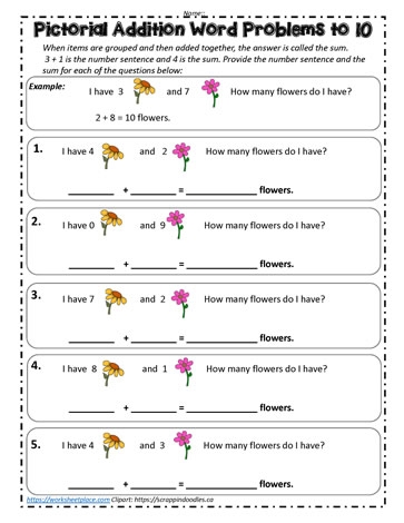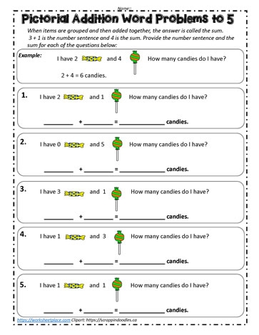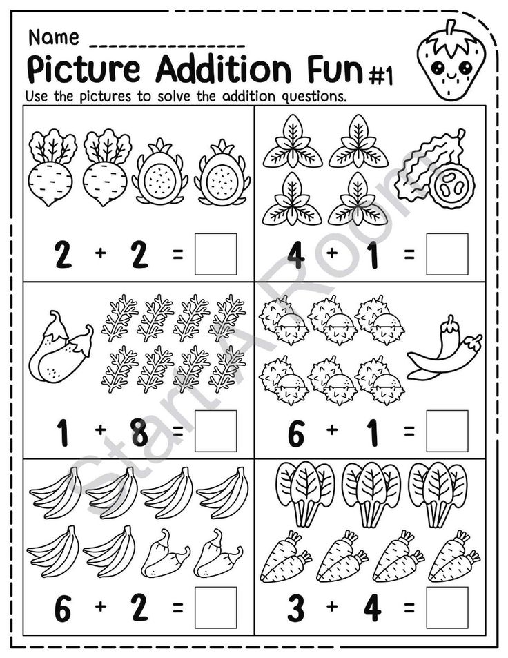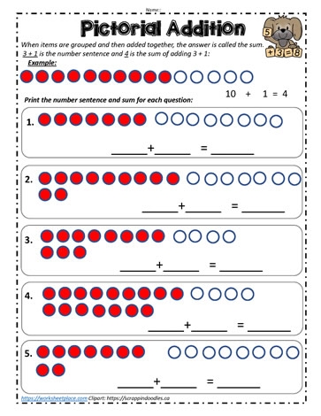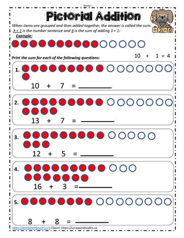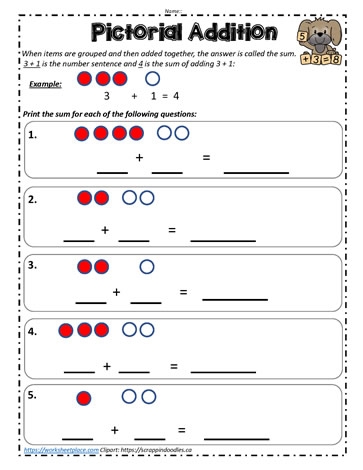 Pictorial addition worksheets often include images of objects such as fruits, animals, or shapes that children can count and add together. For example, a worksheet may feature pictures of apples, with a number next to each apple. Children can then count the total number of apples and write the sum in the provided space.