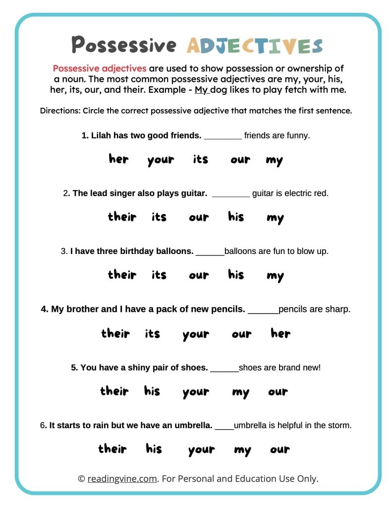A possessive adjective worksheet typically includes a series of sentences or passages with blanks where students must fill in the appropriate possessive adjective. These worksheets may also include questions that require students to rewrite sentences using possessive adjectives or to create their own sentences using possessive adjectives. By completing these exercises, students can practice using possessive adjectives in different grammatical structures and gain confidence in their language abilities.