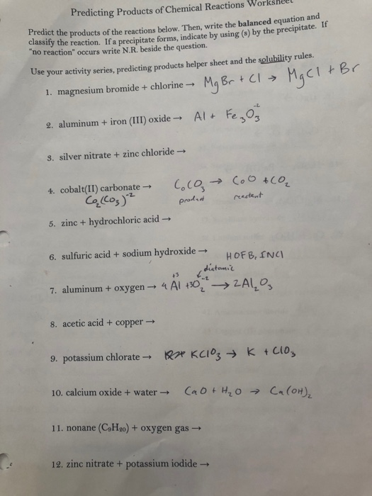 These worksheets often contain a series of chemical reactions along with the reactants, and your task is to predict the products that will be formed based on the given information. By practicing these exercises, you can enhance your skills in reaction prediction and gain a better understanding of the rules and patterns that govern chemical reactions.