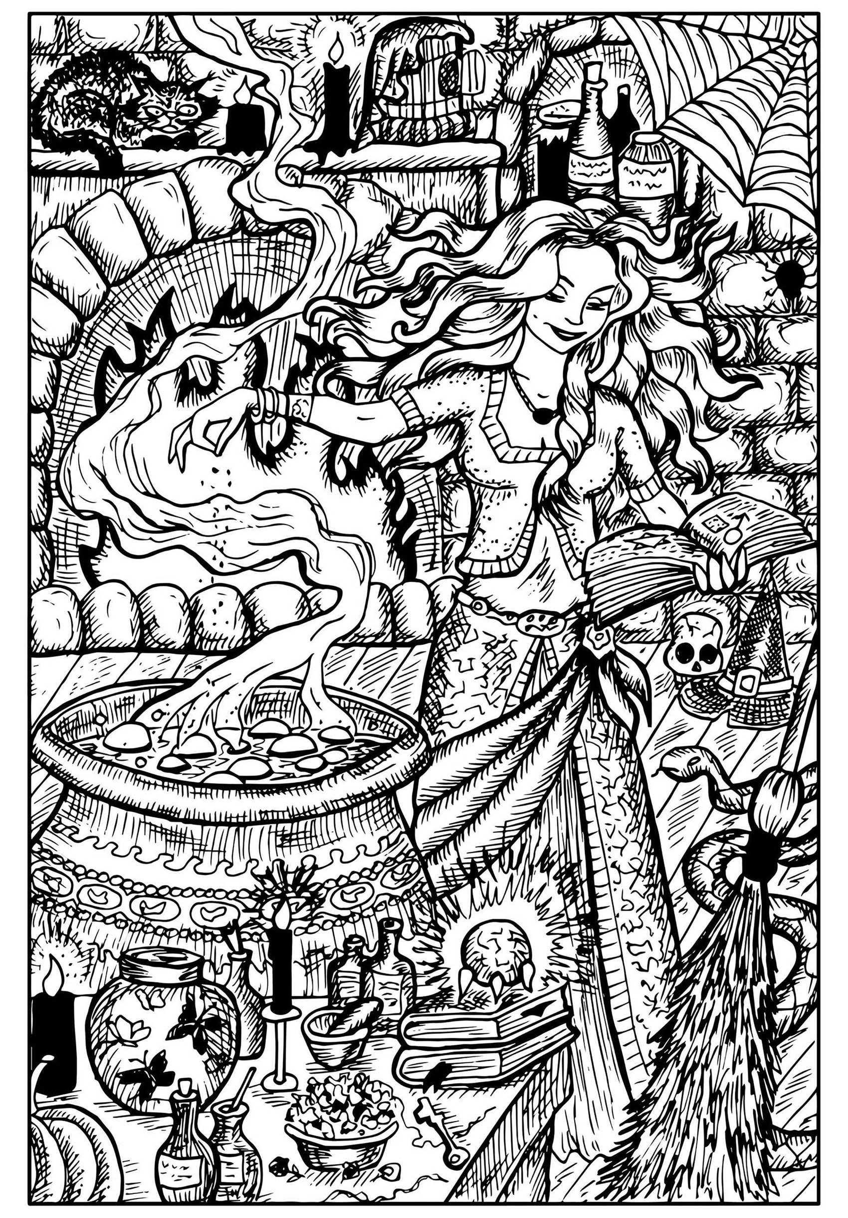 For those looking for a more whimsical and lighthearted option, a cute witch with a bubbling cauldron and friendly black cat might be more your style. This playful image is perfect for younger children and offers plenty of opportunities for imaginative coloring. You can experiment with bright and bold colors to bring this charming witch to life.