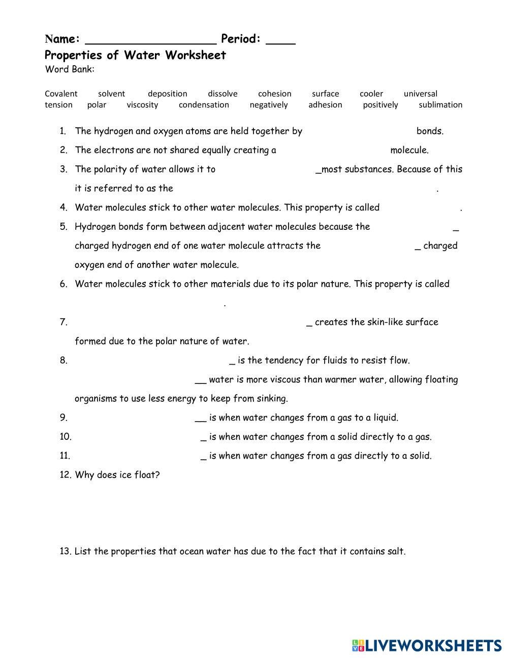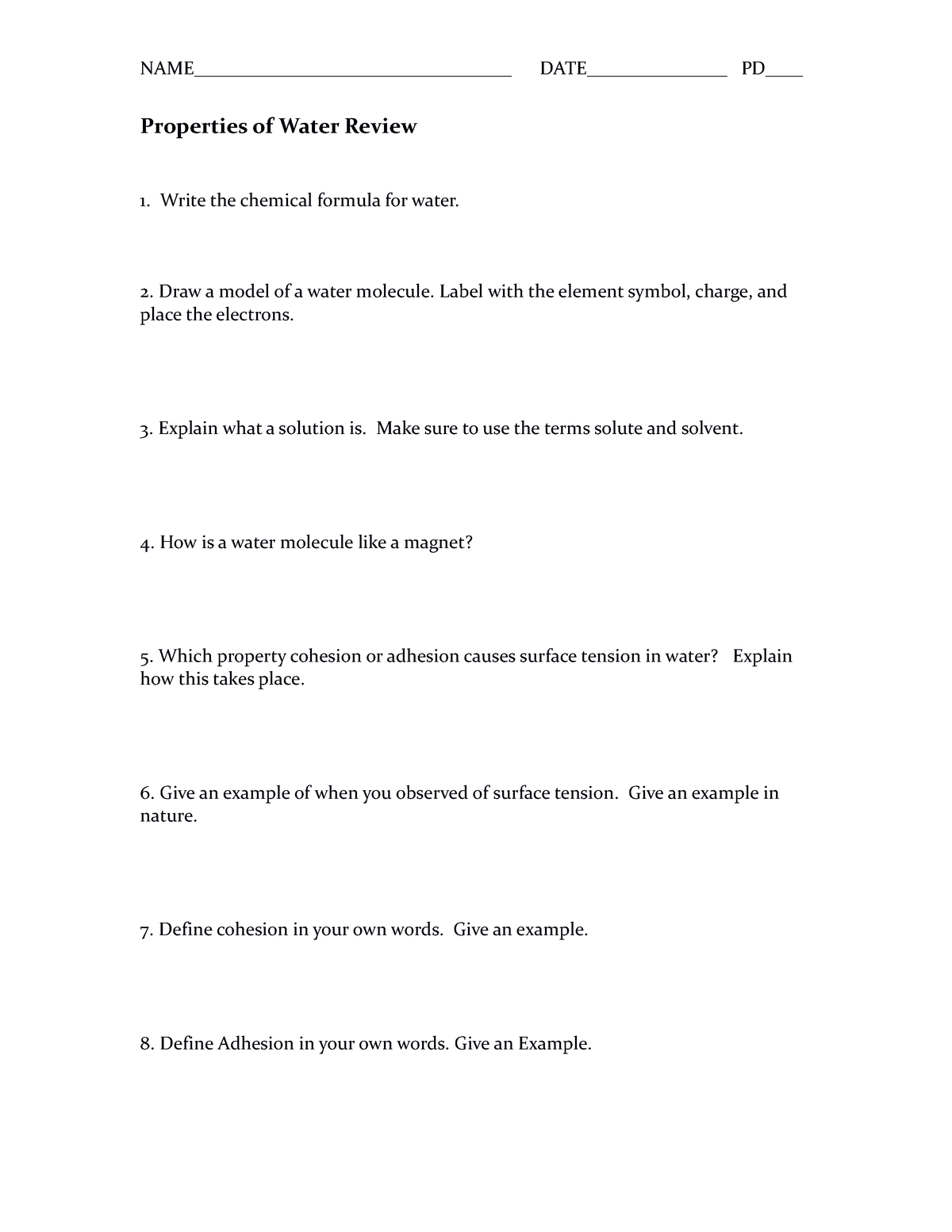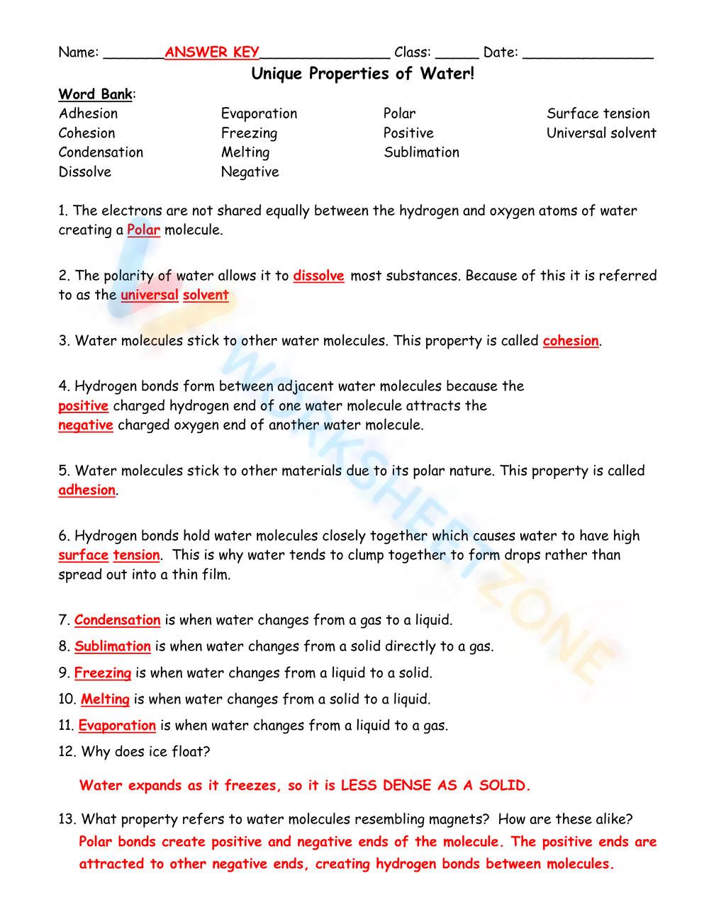 Properties Of Water Worksheet Answers