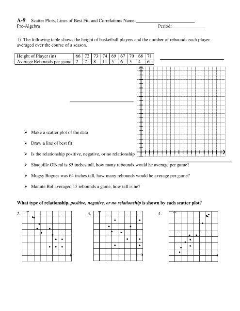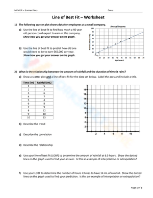 When working with scatter plots and lines of best fit, it is important to understand how to interpret and analyze the data. A worksheet that includes various scatter plots and asks students to identify the relationship between the variables, draw lines of best fit, and make predictions based on the data can be a valuable tool in learning these concepts.