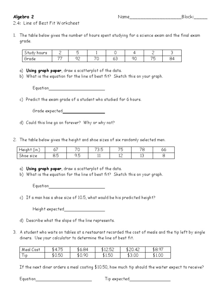 By completing a scatter plots and lines of best fit worksheet, students can improve their understanding of these statistical concepts and develop their skills in data analysis and interpretation. They can learn how to use these tools to make informed decisions and draw meaningful conclusions from the data they collect.