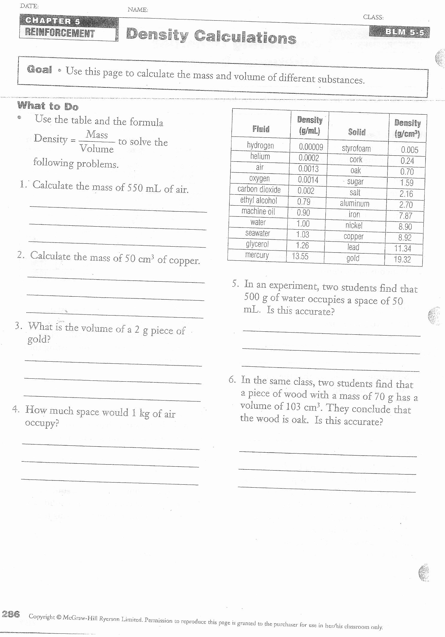 Science 8 Density Calculations Worksheet