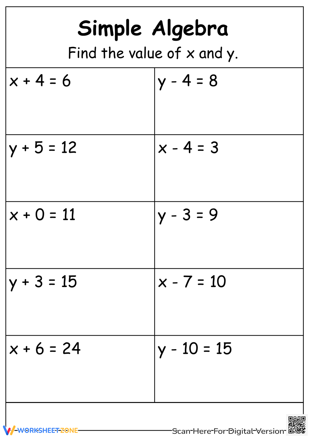 Here are some examples of simple algebra problems that may be included in a worksheet:
